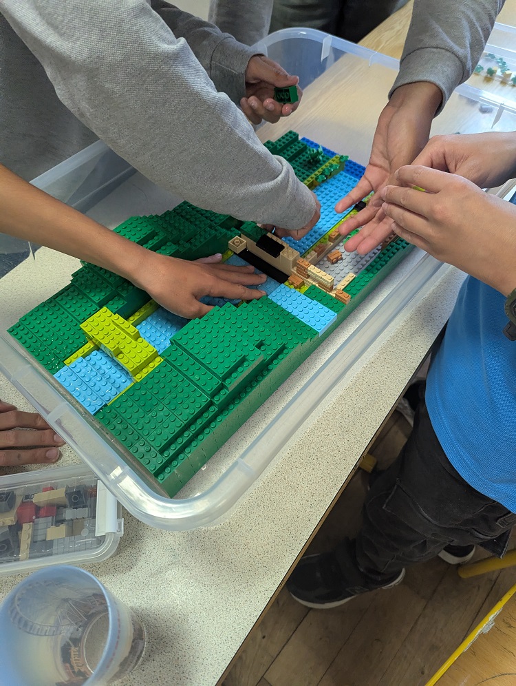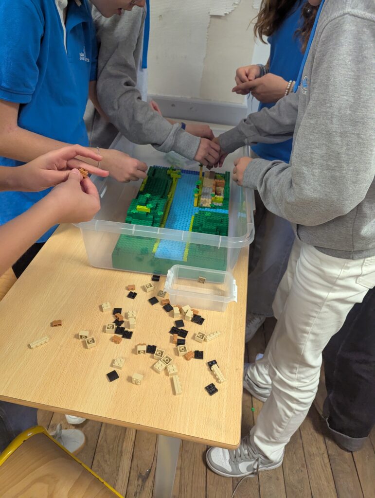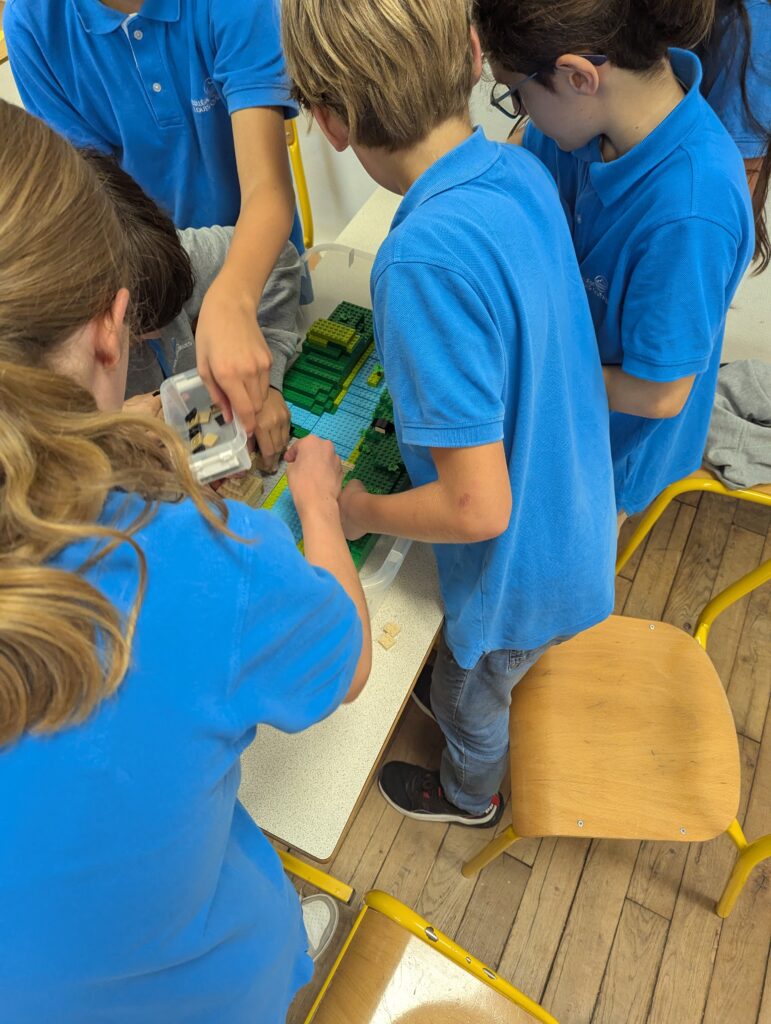 À partir d’une maquette interactive en lego représentant un cours d’eau au centre, deux collines de part et d’autre et une zone en bas de maquette à aménager. Les élèves ont d’abord imaginé librement l’aménagement d’une ville sans prendre en compte les risques d’inondation avec des pièces de lego. Une “grosse pluie” simulée à l’aide d’un gobelet d’eau renversé sur l’amont du cours d’eau a permis de visualiser les conséquences d’une crue sur les habitations et les infrastructures créés.