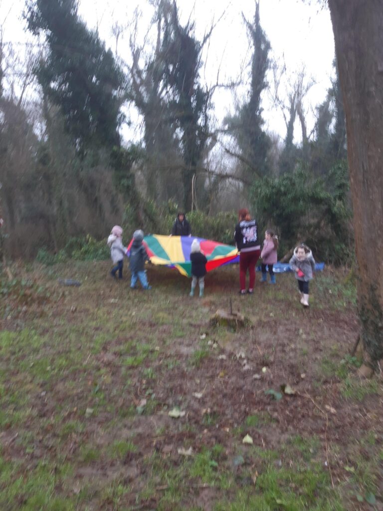 Pendant le jeu libre, certains observent, d’autres se rendent au coin lecture. Le parachute coloré est sorti pour des jeux collaboratifs. Certains dessinent. Les élèves disposent aussi de boîtes-loupes et de petits filets pour capturer et observer des petites bêtes. Quelle joie lorsqu’un groupe parvient à observer un ver de terre ! D’autres jouent au loup. Chacun trouve sa place petit à petit dans cet espace ouvert.